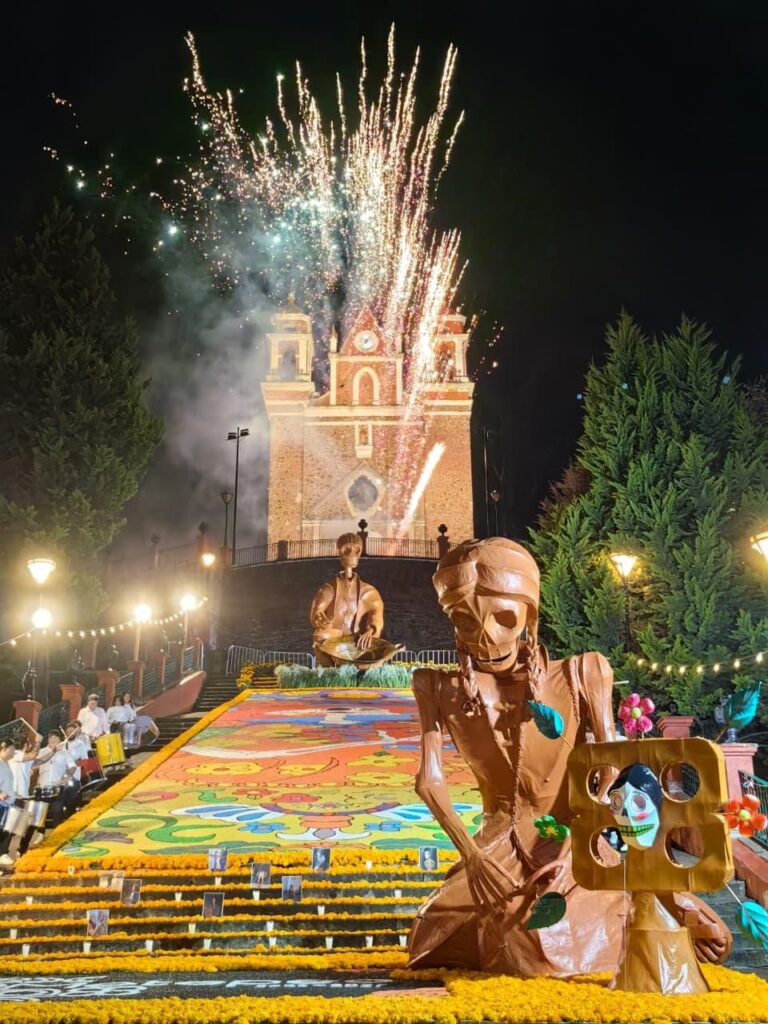 En el centro destaca una catrina sosteniendo un Árbol de la Vida, pieza elaborada por artesanos de Huamantla, Tlaxcala, en alusión al ícono patrimonial de Metepec, reconocido a nivel nacional e internacional.